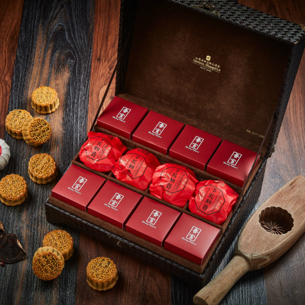 內含:迷你奶黃月餅(三件裝)、迷你砵酒杏甫棗蓉月餅(三件裝)、迷你雨前龍井茶香五仁月餅(三件裝)、斑斕潮式芋泥月餅(三件裝)