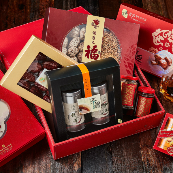 內含:雙黃白蓮蓉月餅 (四件裝)、紅酒 (一瓶)、澳洲兩頭鮑魚 (一罐)、御品花菇蟲草花禮盒 (一盒)、茗茶禮盒 (一盒)、野生松茸麵禮盒 (一盒)、新彊雪棗禮盒 (一盒)、香宮XO醬 (一瓶)、鹽焗腰果 (一瓶)、楓蜜 (一瓶)