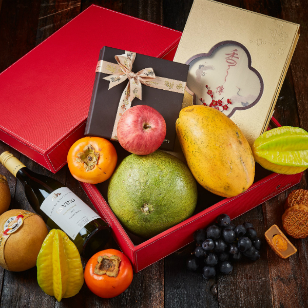 內含:迷你蛋黃白蓮蓉月餅 (八件裝)、白酒 (一瓶)、楊桃 (兩個)、日本富士蘋果 (一個)、林柿 (兩個)、夏威夷木瓜 (一個)、泰國柚子 (一個)、韓國梨 (兩個)、日本巨峰提子 (一包)、Déli Kool 朱古力 (一盒)